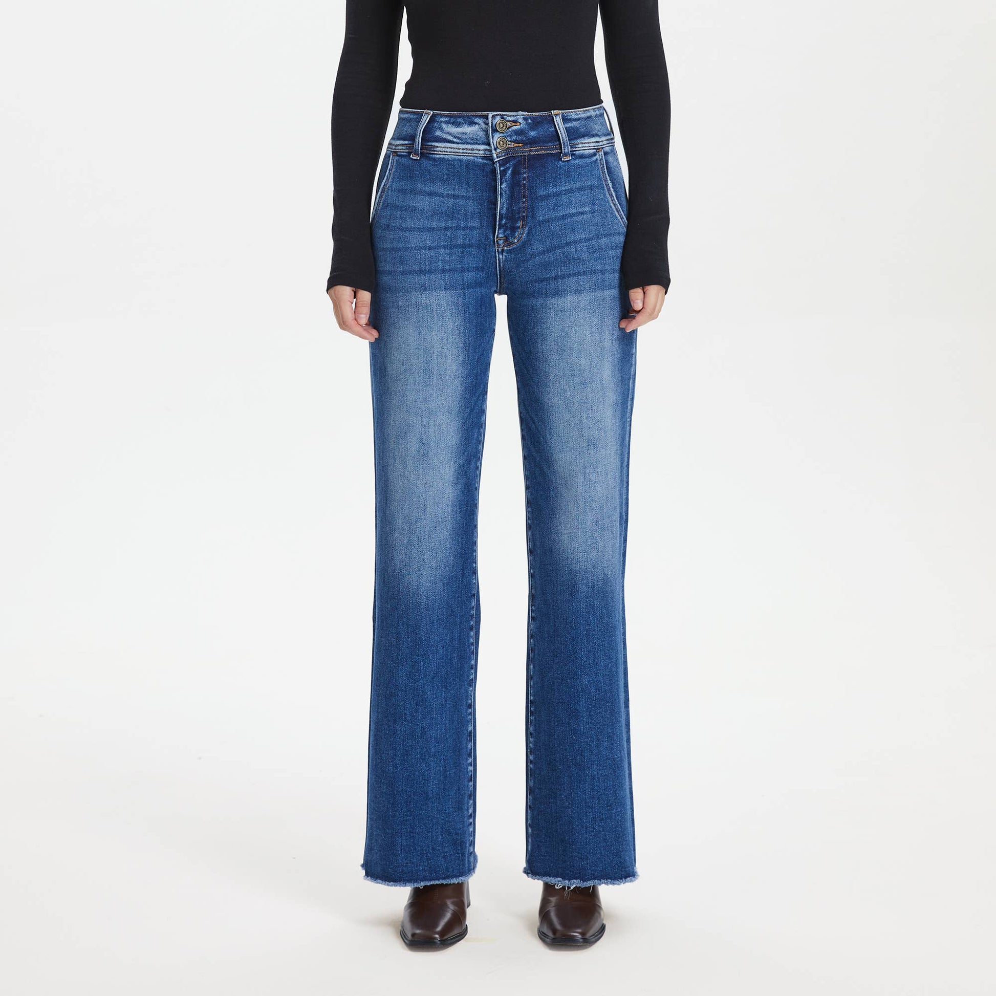 FOUR POCKETS, DOUBLE TUBE BACK POCKETS, HIGH RISE WAIST, ZIPPER FLY, DART DESIGN, NATURAL WASHING EFFECT, RAW HEM, DENIM JEANS