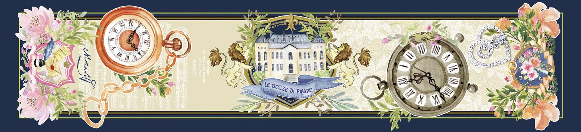 Expressed on my luxurious silk scarf is The Marriage of Figaro. It is ‘A Day of Follies’, set over the course of a single day of chaos – Figaro’s wedding day. Enjoy finding details from Mozart’s opera in this 100% silk twill scarf to include, Count Almaviva’s Manor House in his royal crest with the open window where Cherubino jumps out, Countess Rosina and Susanna’s secret letter to the Count, Susanna’s pin and wedding bouquet, Figaro’s measuring tape for their bridal suite and time pieces to measure the day’s madness.
