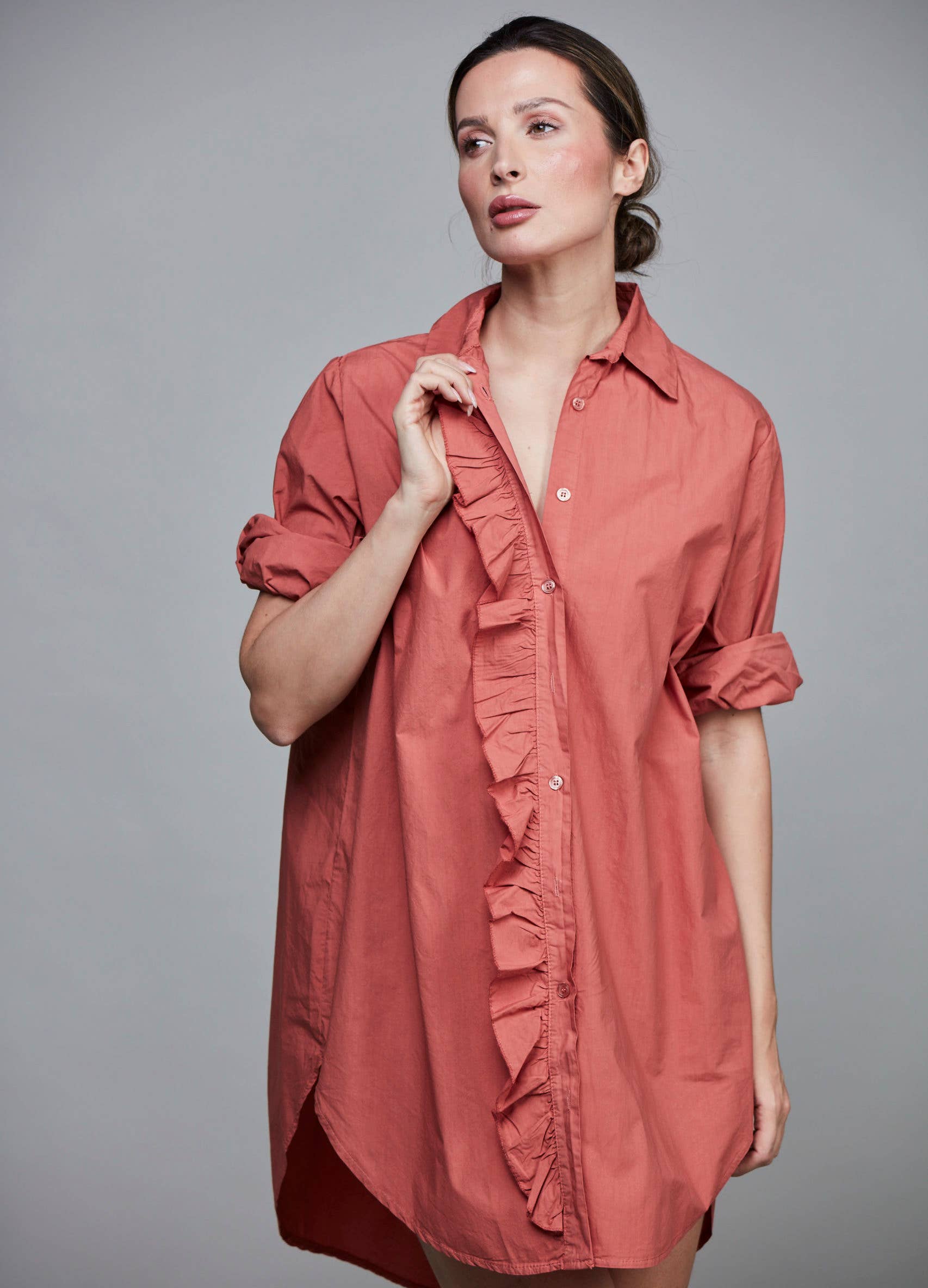 Expertly crafted in Italy, this Girlfriend Cotton Shirt from SixtyDays is made with 100% cotton for a soft and comfortable feel. Featuring a classic button-down design, ruffle detailing, and an oversized fit, this long-sleeved shirt is effortlessly chic and perfect for any occasion.