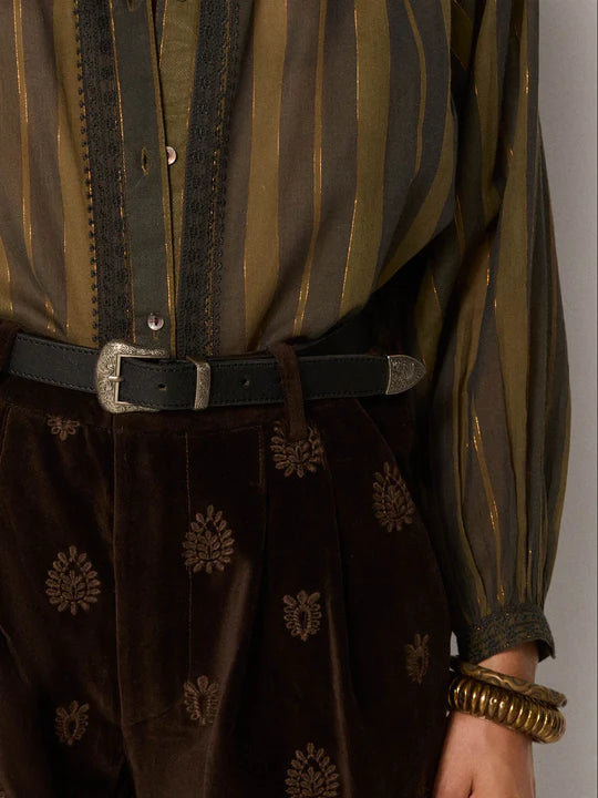 Vertical stripes shimmer between olive and gold, while narrow lace trims frame the placket with crafted precision. Semi–sheer sleeves flow with ease, balancing movement with quiet detail.