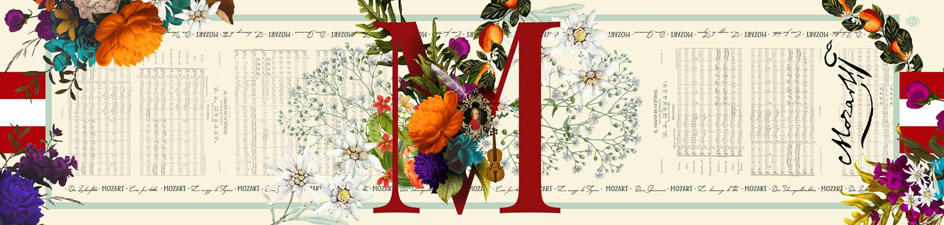 Mozart’s own monogrammed scarf has a glimpse of the Austria flag on each end, and beloved Vienna Edelweiss flowers on an ivory backdrop. Music scores by Mozart are in the background with a list of his operas along the scarf edges. Seville Oranges represent the Seville setting of The Marriage of Figaro and Don Giovanni; Mozart’s popular operas.