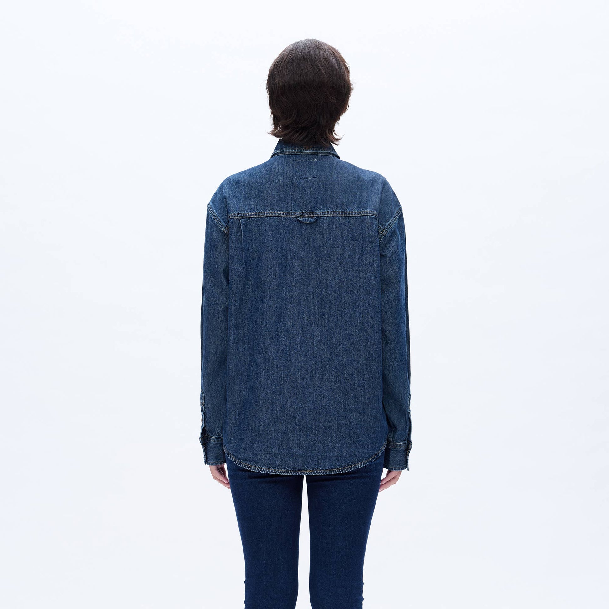 TWO CHEST POCKETS, BUTTON PLACKET, COLLARED, LONG SLEEVE, SEAM DESIGN, NATURAL WASHING EFFECT, FINISHED HEM, DENIM SHIRT