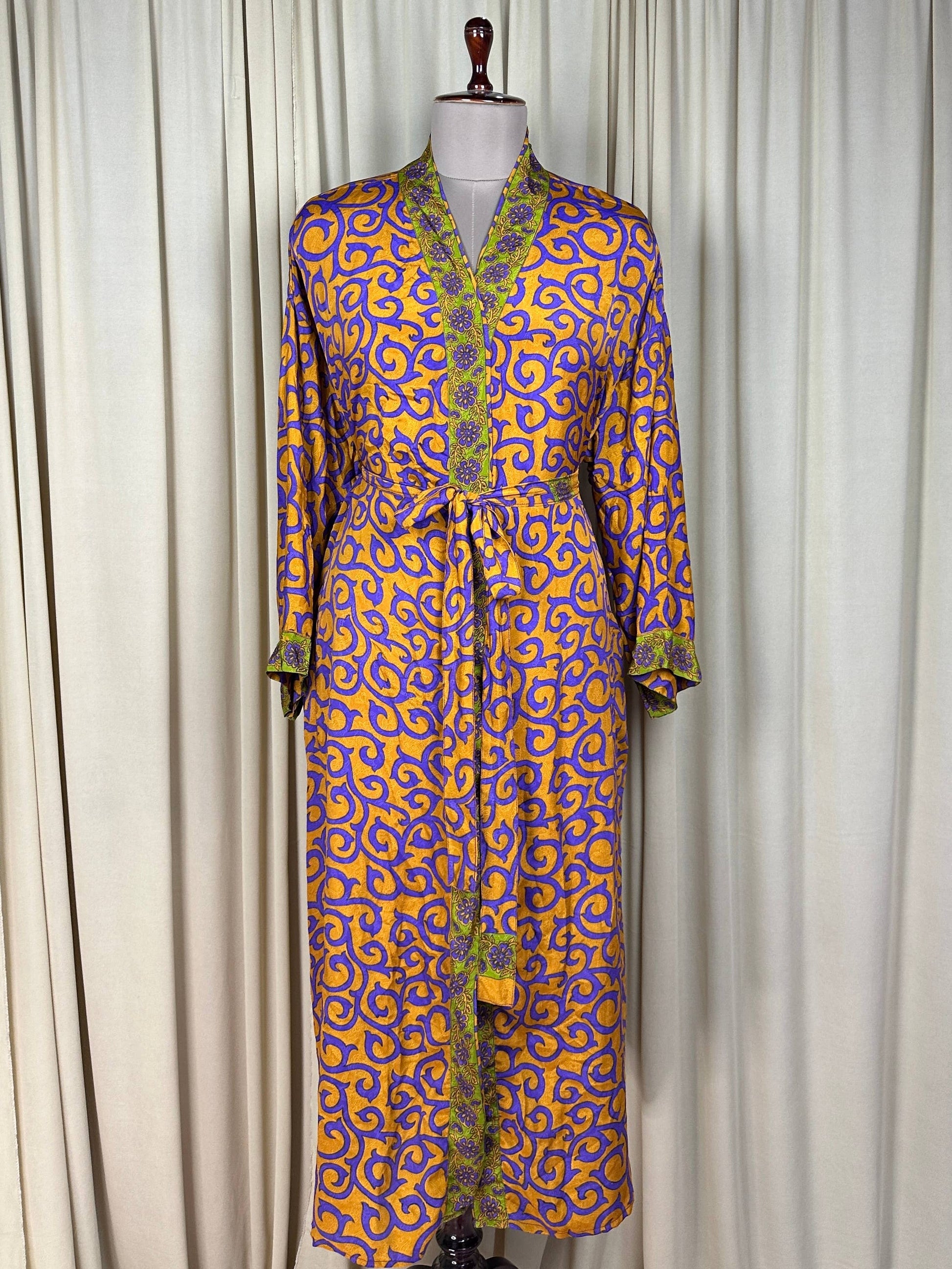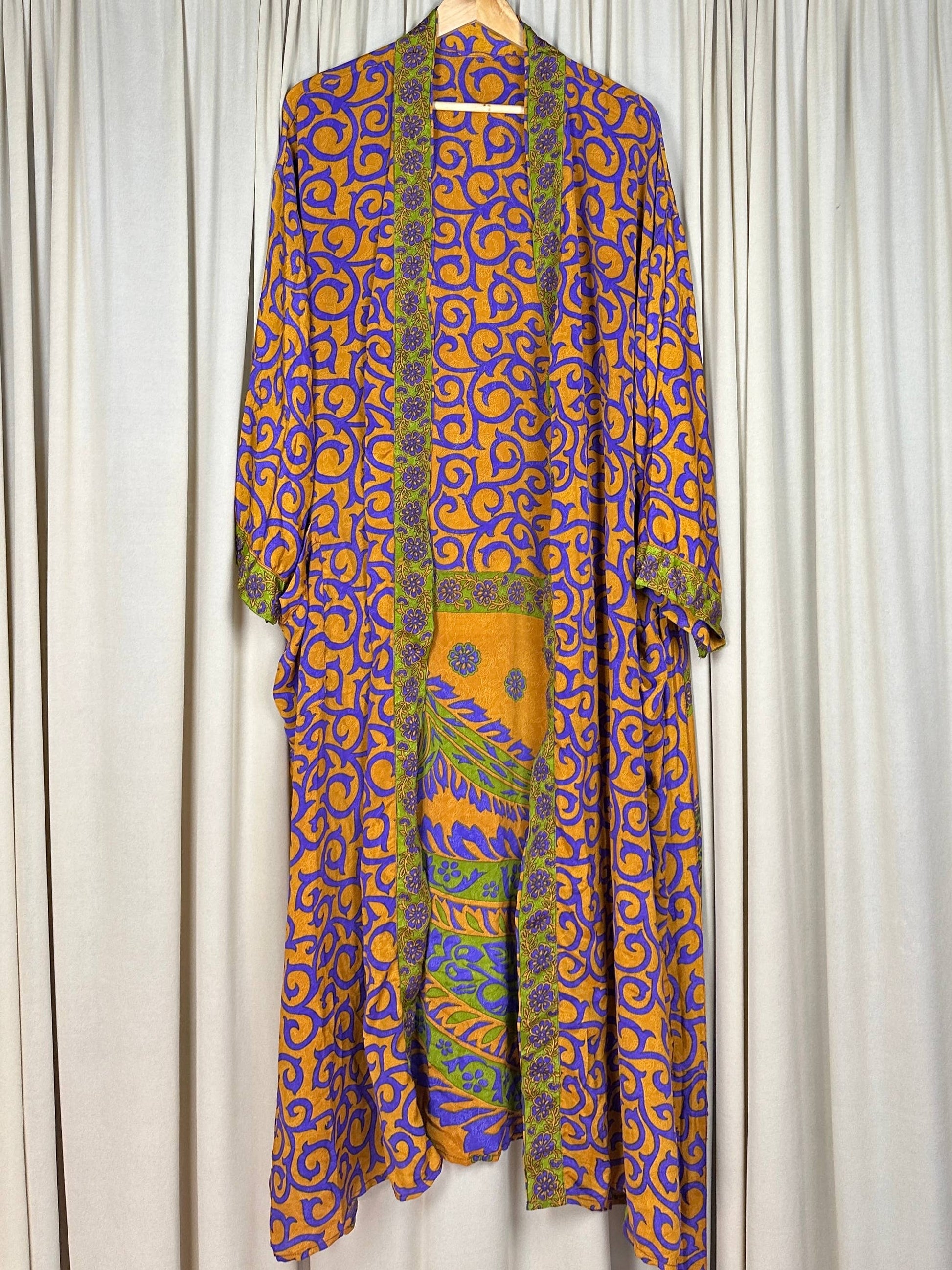 Discover the effortless elegance of our Recycled Silk Kimono, thoughtfully crafted from vintage saris and handmade by our artisan team in Jaipur. This weightless wonder drapes beautifully with every movement, offering a luxurious softness that invites relaxation. Whether you're lounging at home, heading to the beach, or styling a casual day out, this versatile piece adapts to your lifestyle. The low-maintenance fabric requires no ironing and travels beautifully, making it your perfect companion for any adventure. Designed to fit UK sizes 8-16 with a 48-inch bust, this is sustainable style that feels as good as it looks.