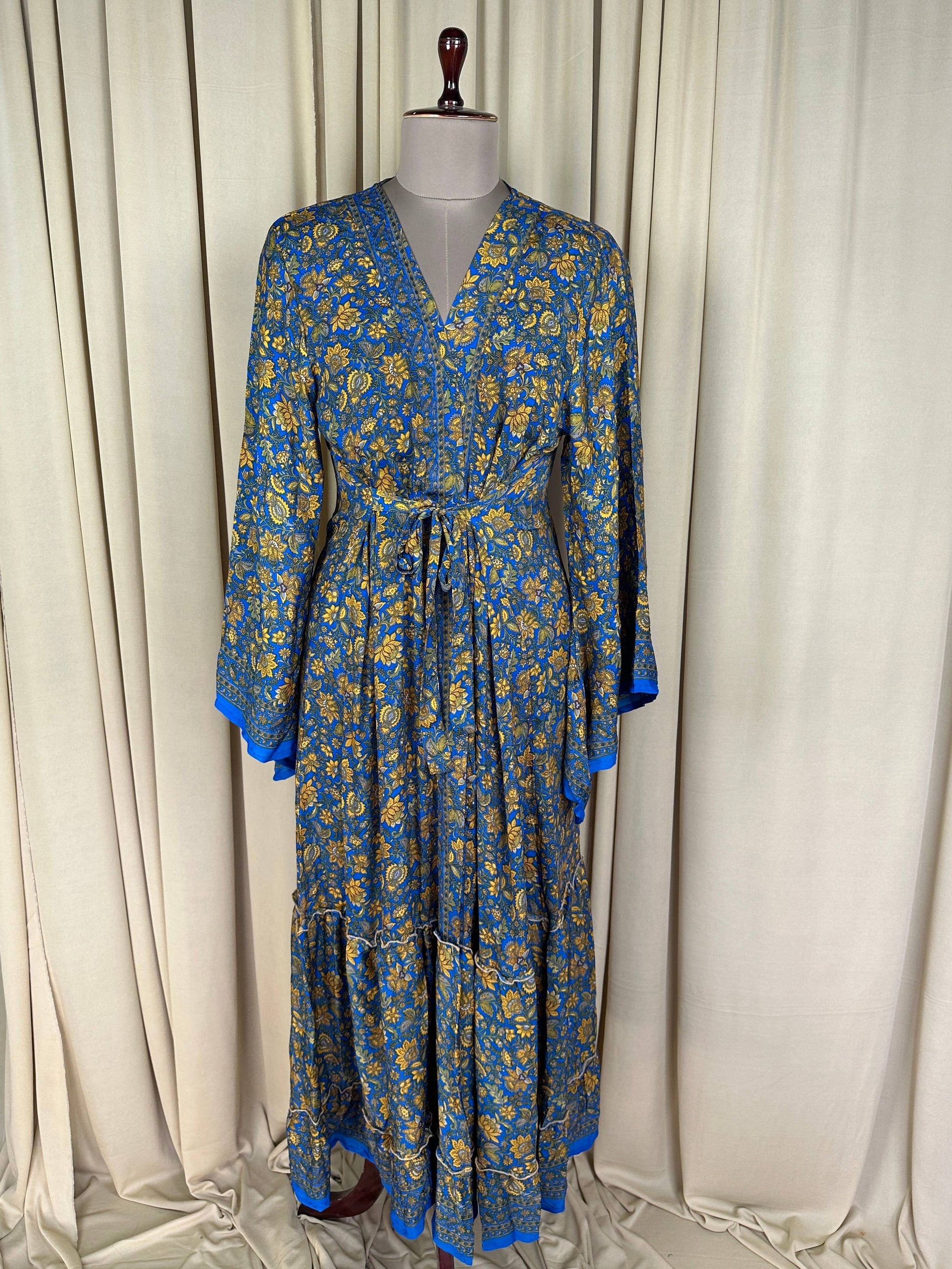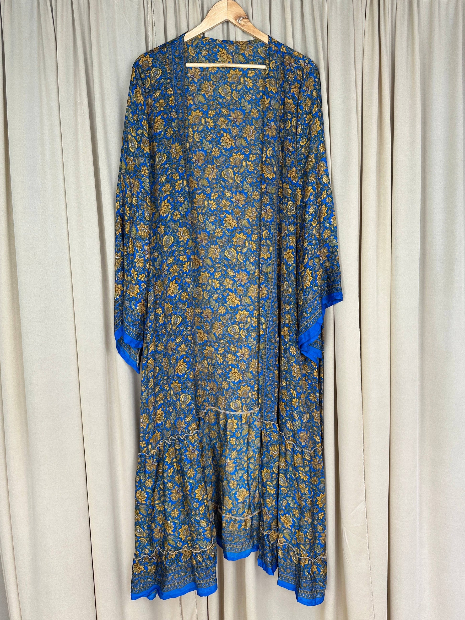 This exquisite robe is handmade from carefully selected vintage saris, offering a one-of-a-kind piece crafted from recycled silk. Lightweight and breathable, it moves gracefully with you, making it perfect for relaxing at home, dressing up for an evening out,